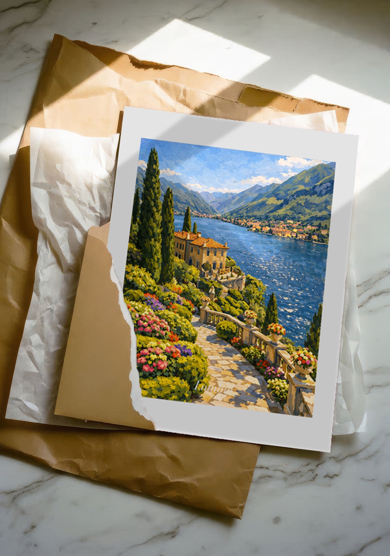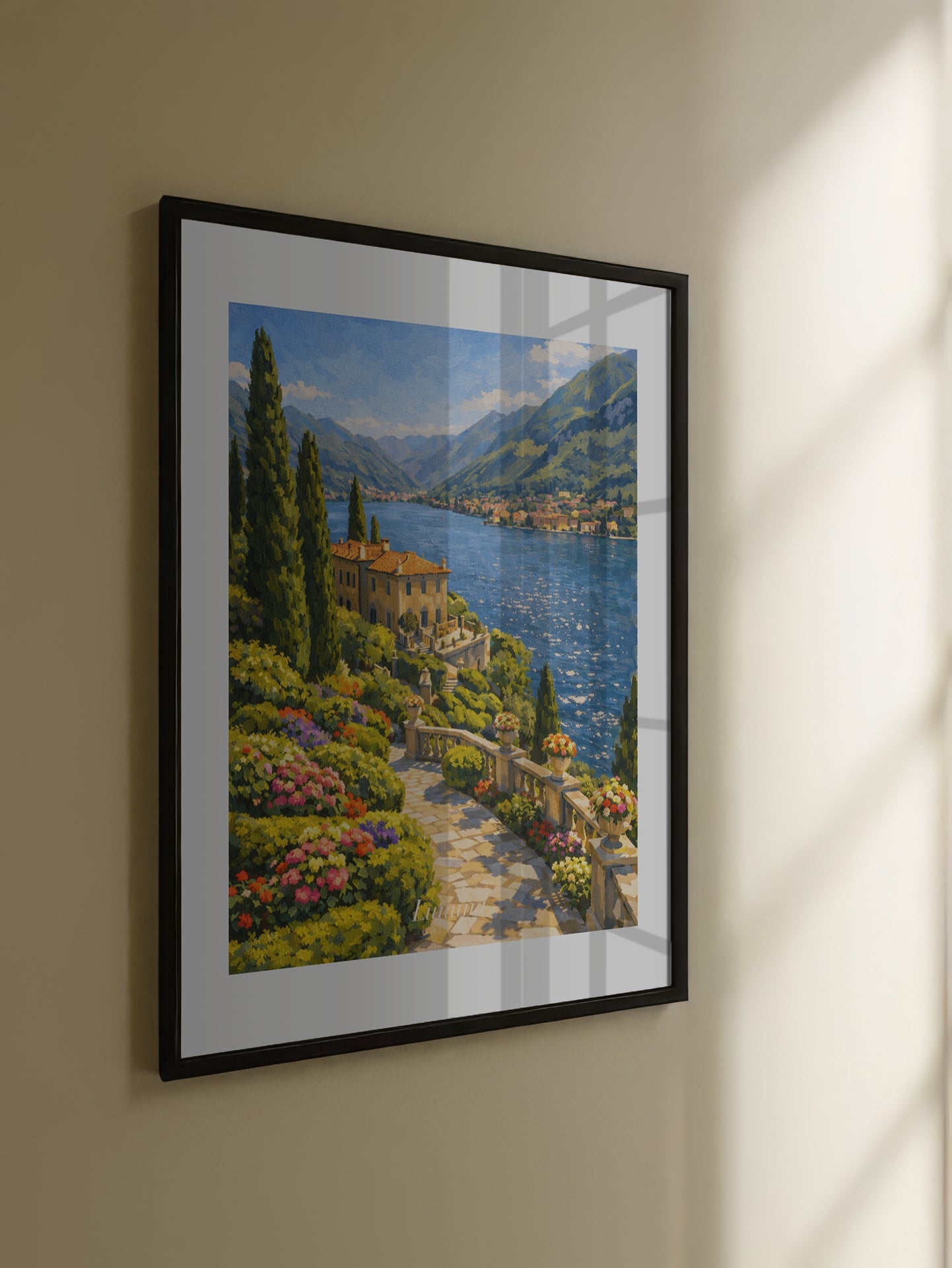 If you love the charm of Italian villas, mountain lakes, and sun-drenched gardens in bloom, this artwork captures that dreamlike atmosphere in a way that feels both luxurious and peaceful.